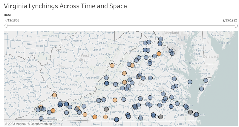 This map, showing lynchings across the state from 1866 to 1932, is part of the “Racial Terror: Lynching in Virginia” research project by Gianluca De Fazio, an associate professor at James Madison University. (James Madison University/ Gianluca De Fazio)