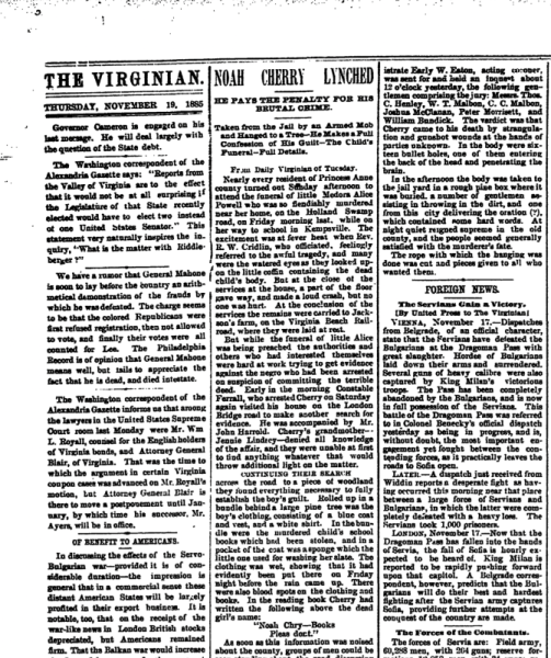 The November 19, 1885 edition of The Virginian included an article about Noah Cherry’s lynching. (America’s News Archive)
