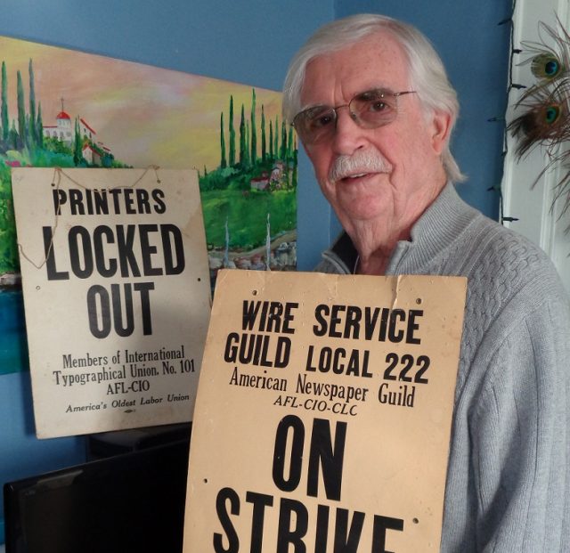 Malcolm Barr Sr., our correspondent, dons his 50-year-old strike placard. Photo/Roger Bianchini