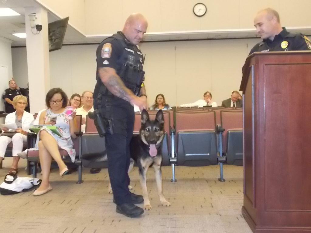 New FRPD K-9 Bosco and Master Police Officer partner Tony Clingerman are introduced to council Monday evening. Seventeen-month-old Bosco was quite wound up for his first public appearance.