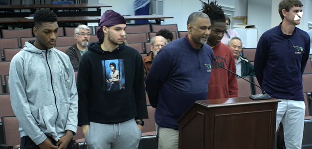 Also, during its meeting, the School Board paid special recognition to the Skyline High School Boys’ Basketball team on Wednesday evening. Head Coach Harold Chunn (above at podium) and Assistant Coach Stephen Rinker (above far right) received the recognition with three of the Hawks’ players: sophomore Dwayne Tucker (above far left) and seniors Elias Carter (second from left) and Zack Diggs (second from right). The Hawks team made it to the state semifinals with a final record of 26 wins and one loss. The team was 14-0 in its Northwestern District division.