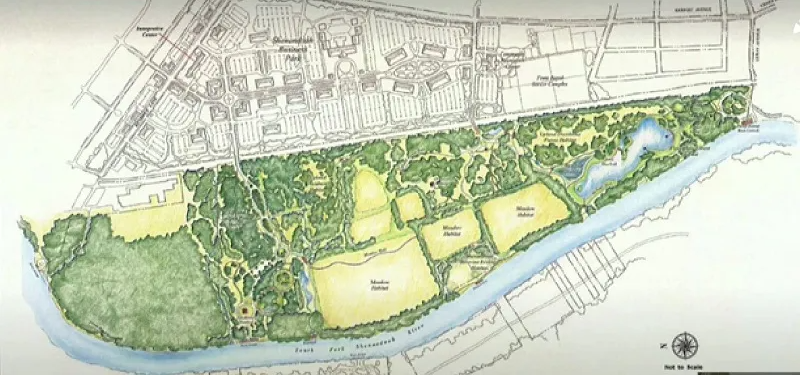 So, what are we working with on this end of town? – Two perspectives of the former federal Superfund/Avtex redevelopment site with the 240-acre Conservancy Park parcel to left between river and railroad tracks in above aerial photo, with planned 148-acre business park in upper right-center. The WC EDA is moving aggressively toward positive movement on both portions of the site. Below, graphic with color portion illustrating low-impact Conservancy Park development. Above that section is b&w rendering of potential development at the business park. Aerial Photos by Roger Bianchini Courtesy of CassAviation and Reggie Cassagnol