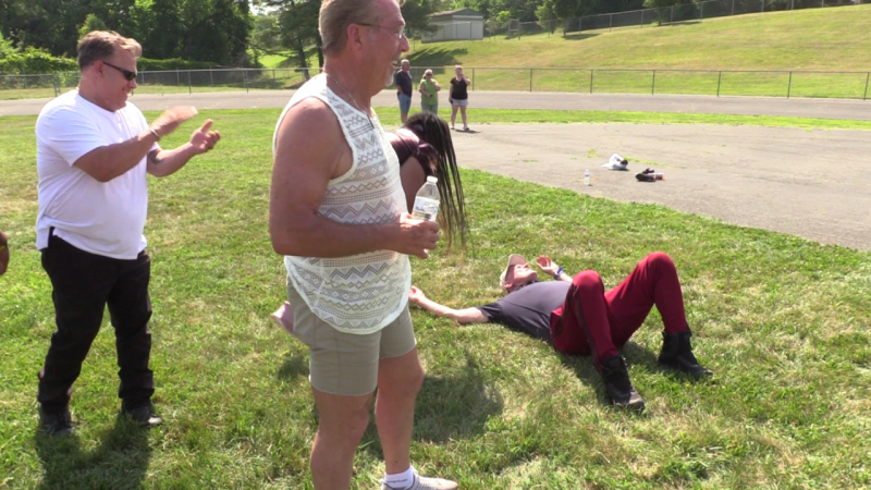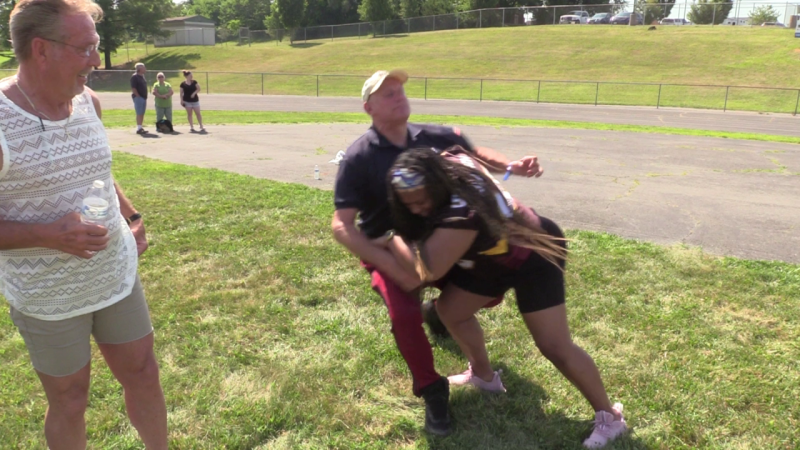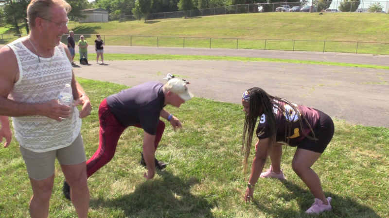 As Mark Mosley watches, Kurt Pierce thinks he can take on Alicia Blanding, Defensive Linewoman for the DC Divas.