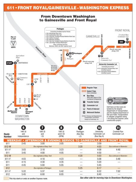 The updated 611 route, now the Front Royal/Gainesville – Washington route, will begin in Front Royal, while the new 612 route, the Warrenton/Gainesville – Pentagon/Navy Yard route, will start in Warrenton. Both routes will stop at the University Commuter Lot in Gainesville before accessing the I-66 Express Lanes. Riders can also transfer between these two routes and the existing 622 Haymarket – Rosslyn/Ballston route at the Gainesville stop.