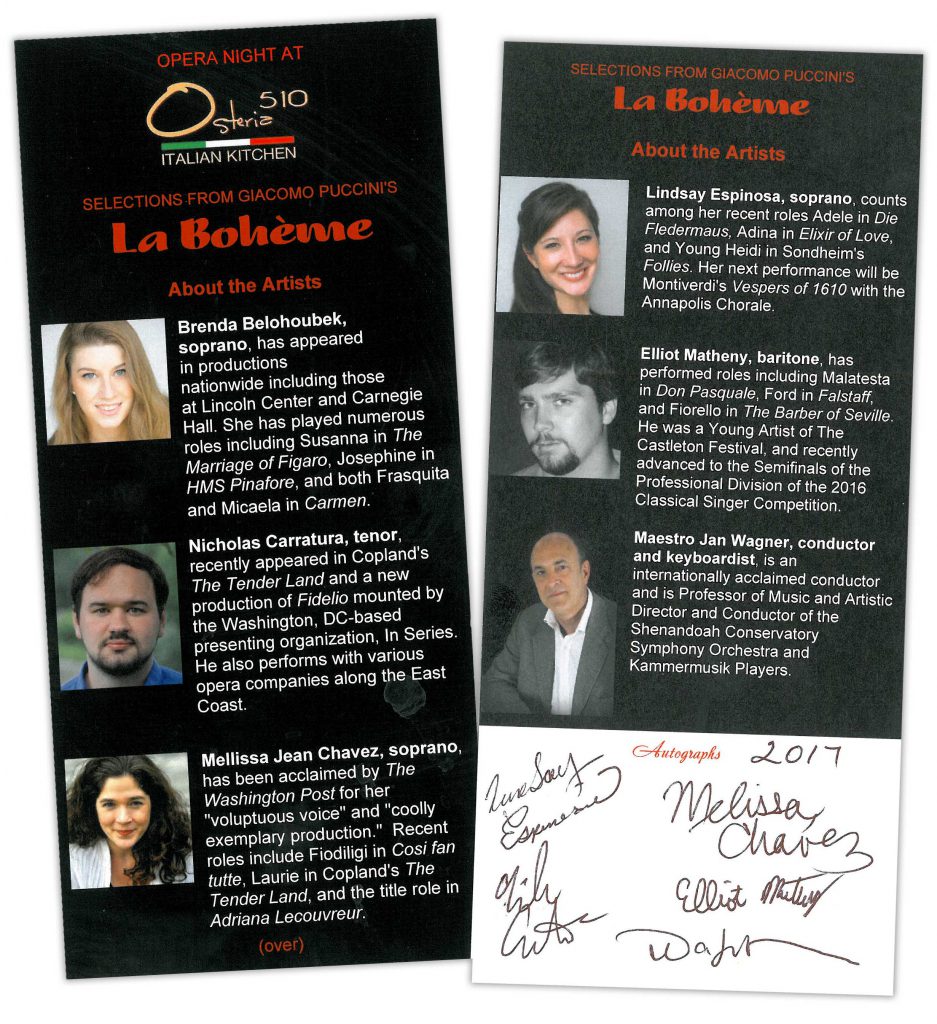 As with “La Boheme,” artists such as soprano Lindsay Espinosa of Annapolis and Brenda Belohoubek, are invited in. Jan Wagner, director and conductor of the Shenandoah Conservatory Symphony Orchestra, is keyboardist and conducts each show which comes with a four-course Italian dinner, the singers performing between courses.