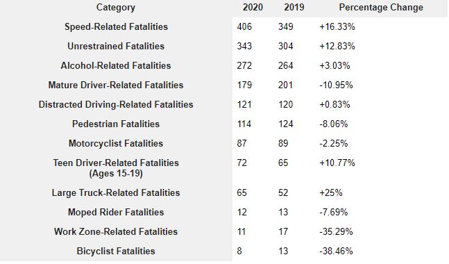 In 2020, there was a significant decline in traffic volume because of the pandemic. However, while serious injuries declined by 5% last year, the number of overall crash fatalities in the Commonwealth increased by 2%, with 847 fatalities reported, compared to 827 in 2019. Speed-related fatalities increased to the highest number in at least 10 years with 406 fatalities reported, a 16% jump over 2019 fatalities. The number of people who weren’t wearing their seat belts killed as a result of crashes also increased in 2020, with 343 fatalities reported compared to 304 in 2019.