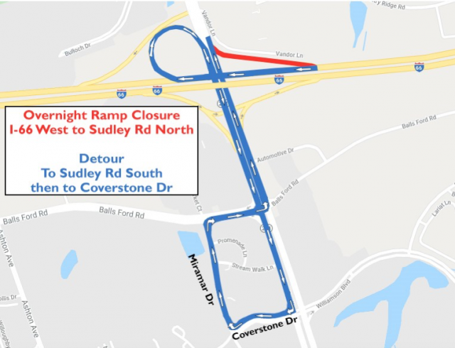 The ramp from westbound I-66 to northbound Route 234 Business (Sudley Road) will be closed from midnight to 4 a.m. Traffic will be detoured to Route 234 Business South, turn right at the third traffic signal onto Coverstone Drive, take the first right at Miramar Drive, turn right on Balls Ford Road, then turn left at the traffic signal on to northbound Route 234 Business.