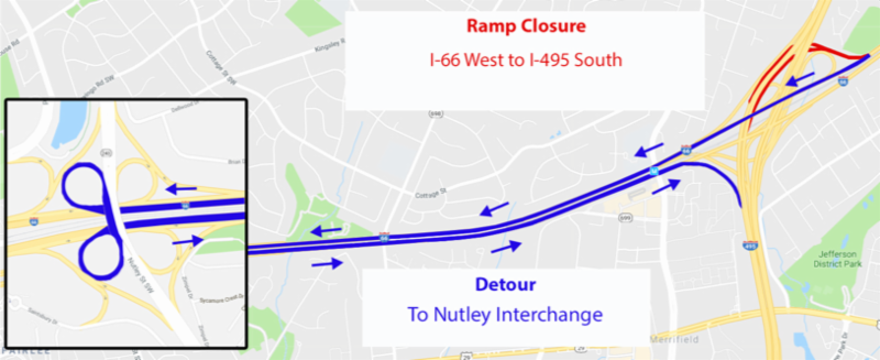 • The ramps from westbound I-66 to southbound I-495 Express Lanes and regular lanes will be closed during Friday night’s overnight hours from midnight to 4 a.m. Drivers will be detoured to the exit for southbound Nutley Street (Route 243), stay to the right for I-66 East, then follow signs to I-495 South.