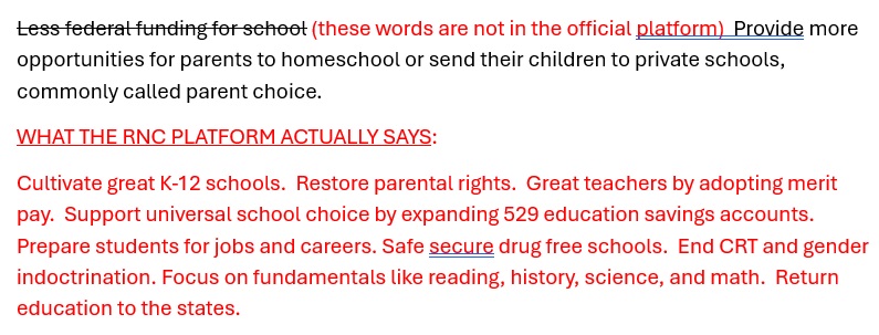 According to Salins, the material presented to students contained factual inaccuracies, misleading summaries, and omitted critical details from the official RNC platform. Below are the key discrepancies she identified, taken from the materials: