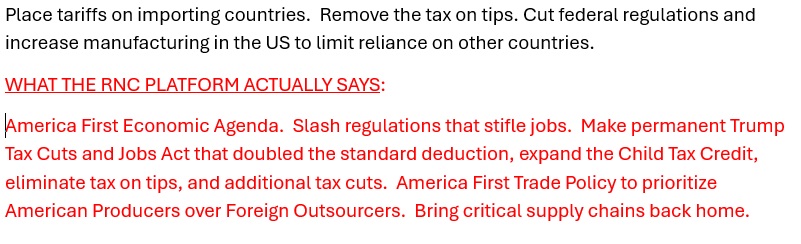 Economic Policy: The lesson included statements about “placing tariffs on importing countries” and “cutting federal spending means taking money out of services.” Salins contends that the RNC platform actually prioritizes tax cuts, reducing regulations, strengthening domestic manufacturing, and ensuring financial stability for seniors.