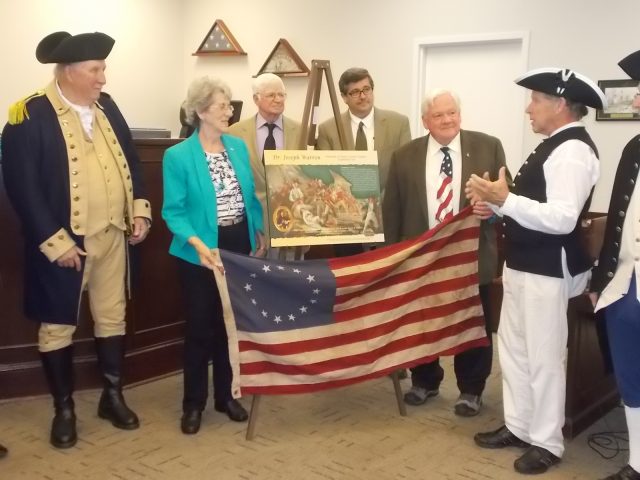 There may only be 13 stars on it but don’t let that flag hit the ground either. Sons of the American Revolution James Wood Chapter President Dale Corey, right, gives a little context to the Dr. Joseph Warren plaque presentation to county officials.