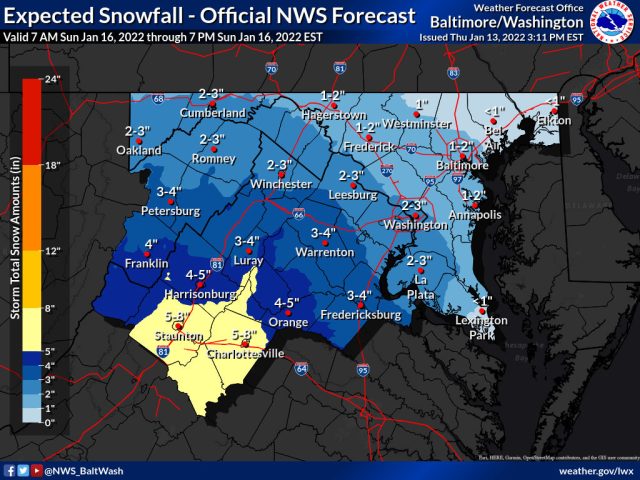 As of January 13, the weather forecasts have all regions of Virginia being affected by varying combinations of precipitation starting late Saturday, Jan. 15, and continuing through Sunday, Jan. 16. This winter storm system is also expected to impact much of the East Coast, especially along the I-95 corridor – for those who may be traveling out of or returning to Virginia over the weekend.