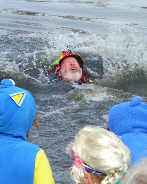 Dressed in attire ranging from penguins – there was a family of four which happily coexisted with the ever-present shark in the lake – rabbits, cats, our friendly shark and a mermaid. One of a sub group of plungers, looking like an off-duty waiter in white shirt, tie, and black pants, though vaguely familiar, was Front Royal Police Chief Kahle Magalis, who along with more flamboyantly dressed local B’Dub Chauffeur Michael Williams, were the first seen to go “all in” the lake. Magalis’s effort put him up there behind the first five money earners.