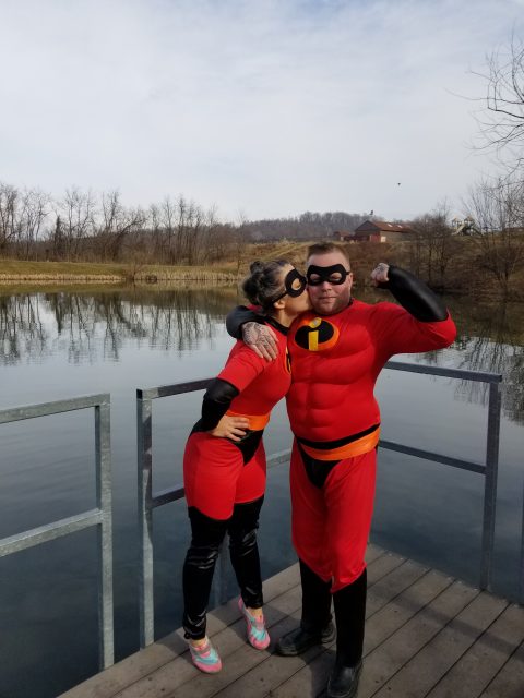 Aders, dressed to represent the shelter’s cat population, left a shoe behind in the lake, but allowed as how “the water didn’t feel as cold as I expected” – an opinion shared by several participants, possibly still in “lake-effect” shock, while hurrying to portable changing rooms and a heated tent to change soaked clothing. Aders appeared at the “after plunge” party at a sponsoring VinoVA restaurant on East Main Street still wearing the whiskers she’d painted on her face – it’s a good look for a humane society board president, Ellen.