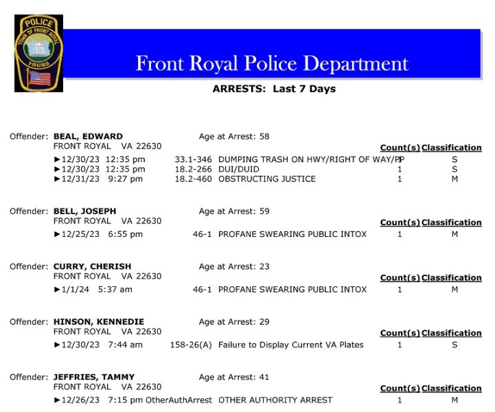 Front Royal Police Department’s arrest report for the past 7 days: