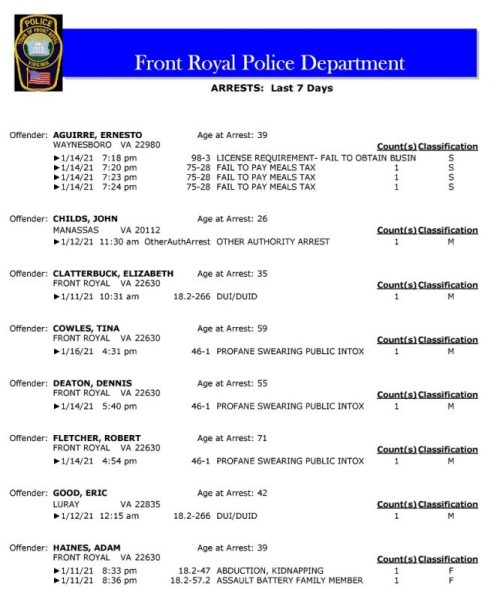 POLICE: 7 Day FRPD Arrest Report 1/18/2021
