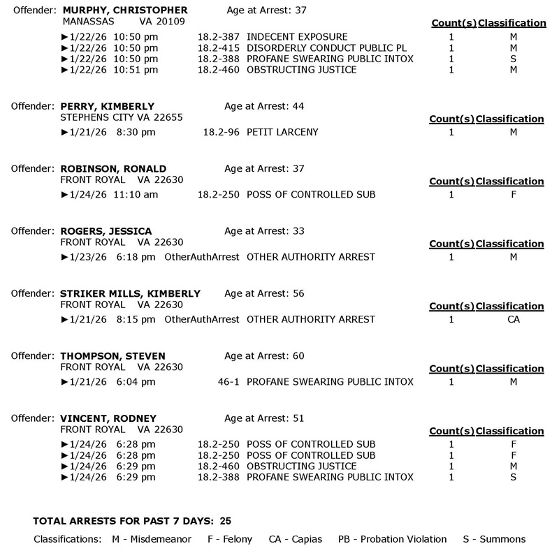 Front Royal Police Department’s arrest report for the past 7 days: