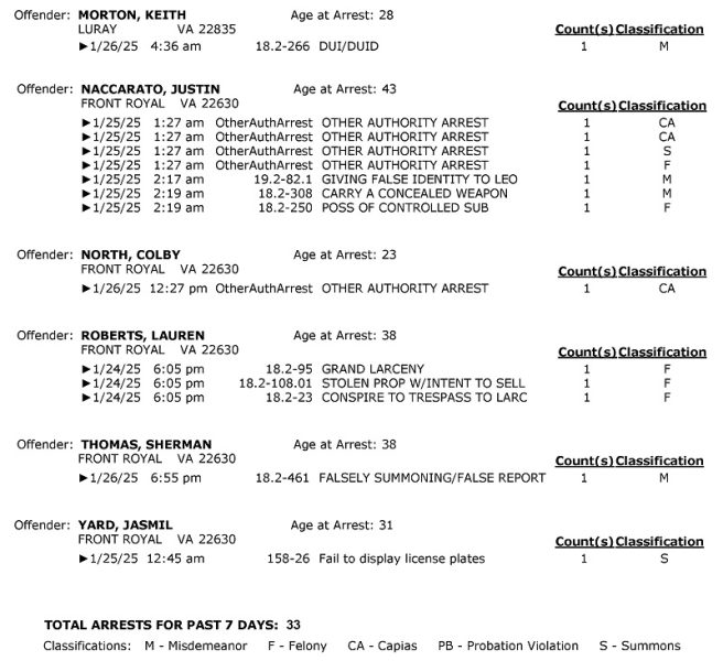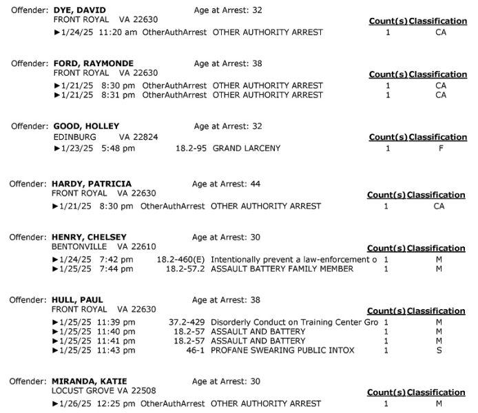 Front Royal Police Department’s arrest report for the past 7 days: