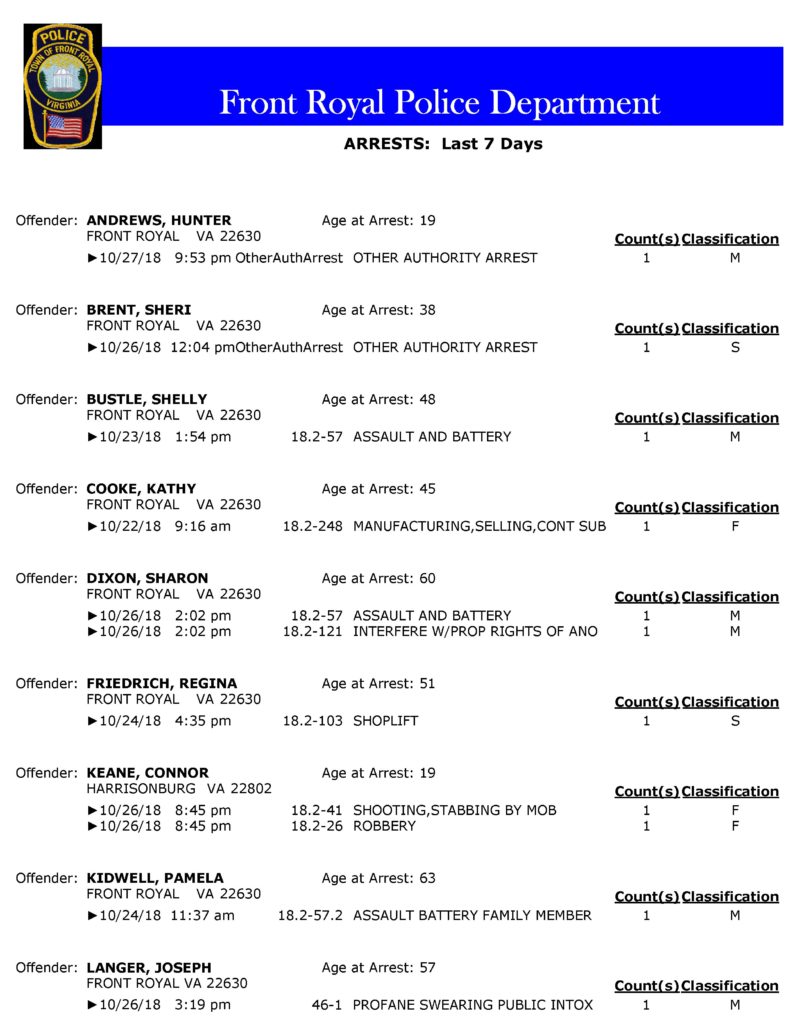 POLICE: 7 Day FRPD Arrest Report 10/29/2018