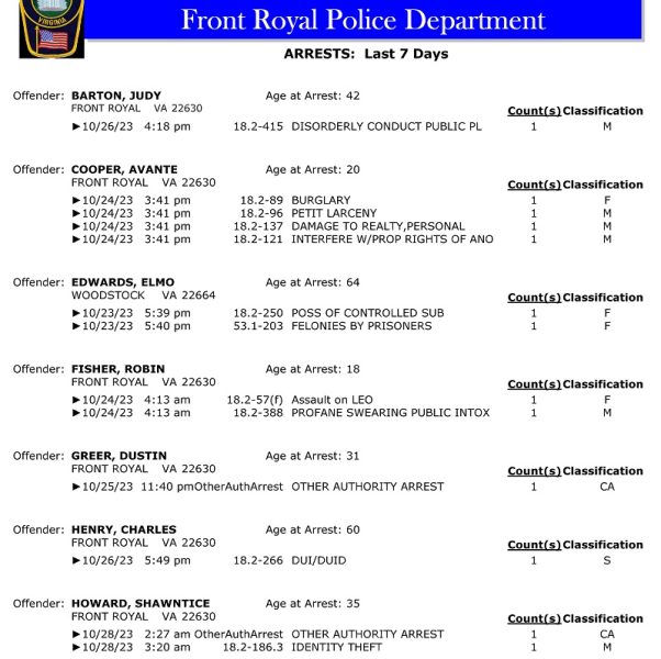 Front Royal Police Department’s arrest report for the past 7 days: