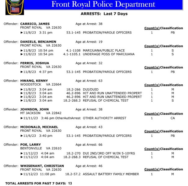 Front Royal Police Department’s arrest report for the past 7 days: