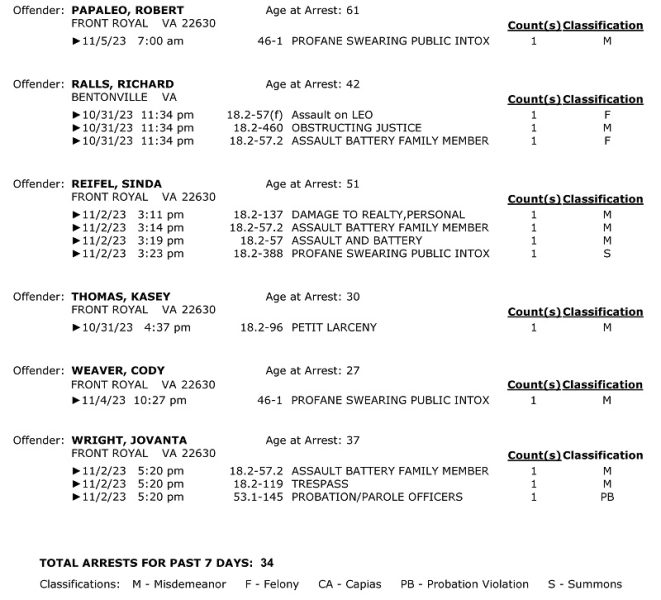 Front Royal Police Department’s arrest report for the past 7 days: