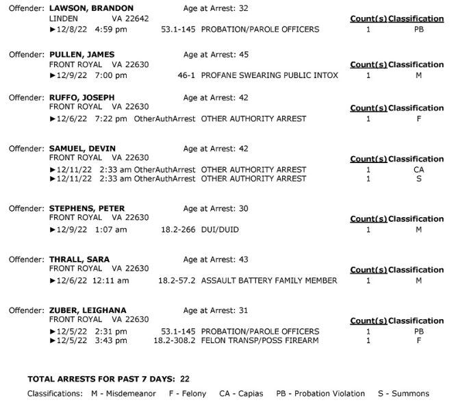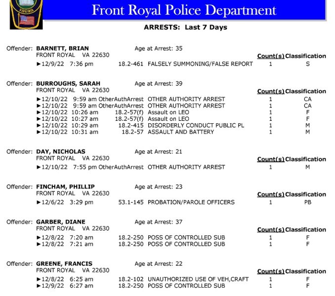 POLICE: 7 Day FRPD Arrest Report 12/12/2022