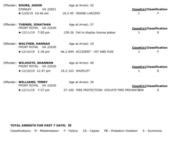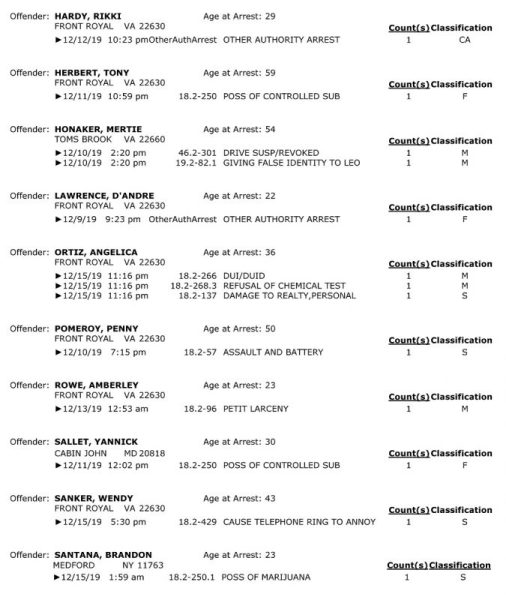 POLICE: 7 Day FRPD Arrest Report 12/16/2019