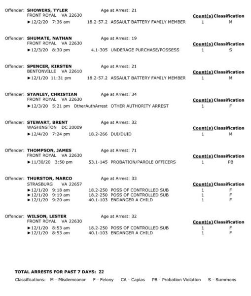 POLICE: 7 Day FRPD Arrest Report 12/7/2020