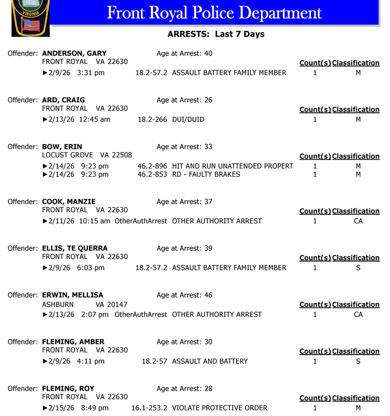 Front Royal Police Department’s arrest report for the past 7 days: