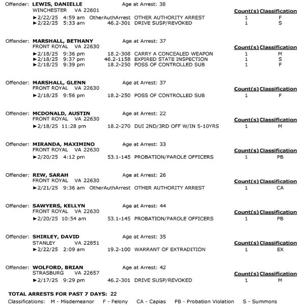 Front Royal Police Department’s arrest report for the past 7 days: