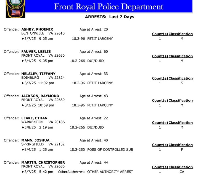 POLICE: 7 Day FRPD Arrest Report 3/10/2025