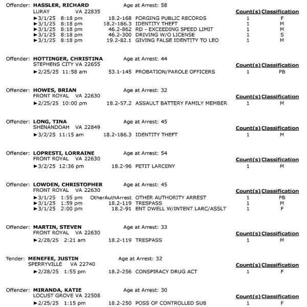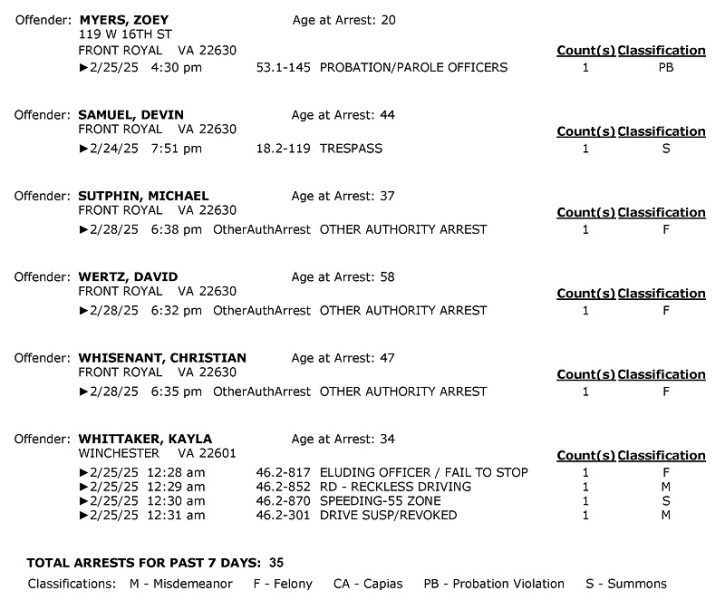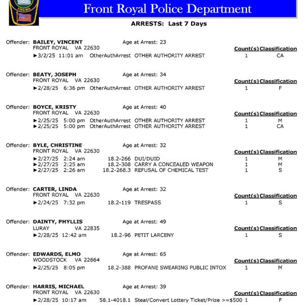 Front Royal Police Department’s arrest report for the past 7 days: