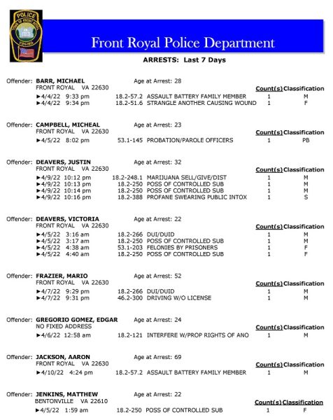 POLICE: 7 Day FRPD Arrest Report 4/11/2022
