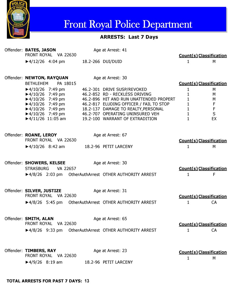 POLICE: 7 Day FRPD Arrest Report 4/13/2026