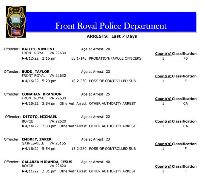 POLICE: 7 Day FRPD Arrest Report 4/18/2022