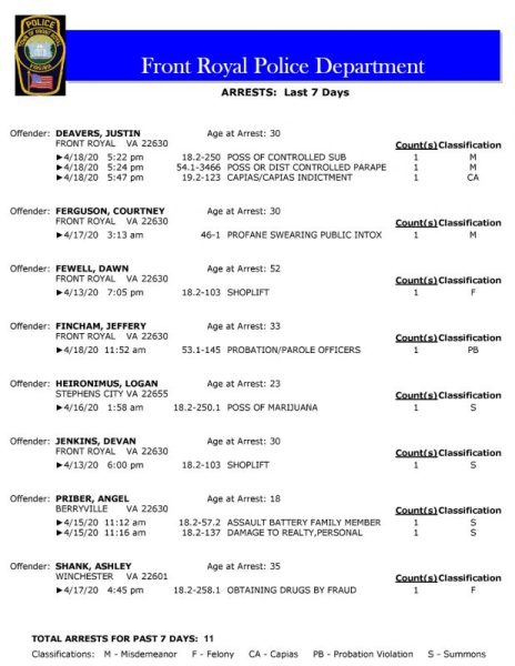 POLICE: 7 Day FRPD Arrest Report 4/20/2020