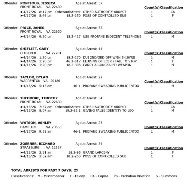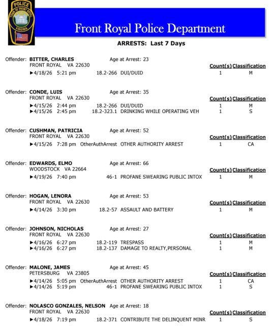 Front Royal Police Department’s arrest report for the past 7 days: