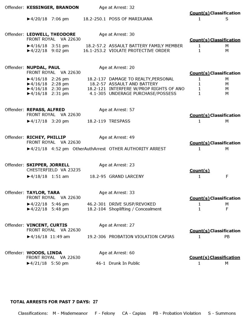 POLICE: 7 Day FRPD Arrest Report 4/23/2018