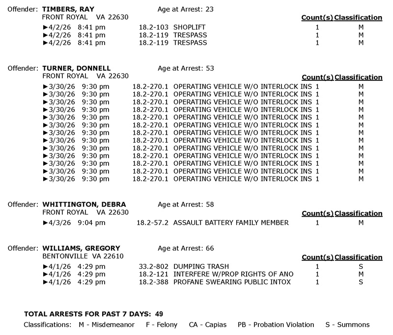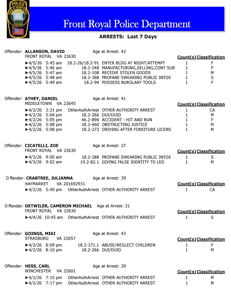 Front Royal Police Department’s arrest report for the past 7 days: