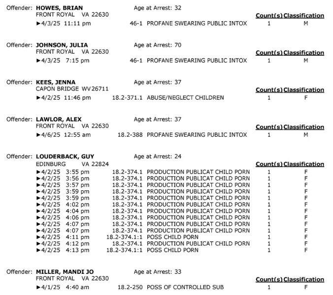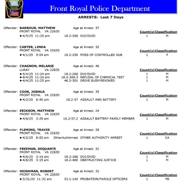 Front Royal Police Department’s arrest report for the past 7 days: