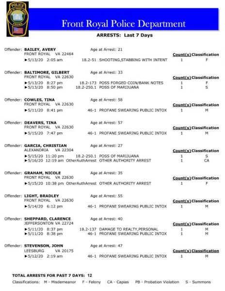 POLICE: 7 Day FRPD Arrest Report 5/18/2020