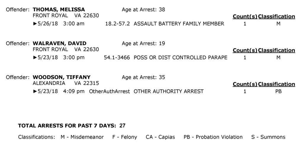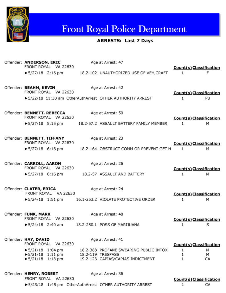 POLICE: 7 Day FRPD Arrest Report 5/28/2018