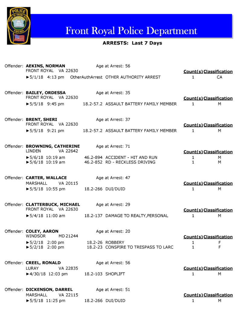 POLICE: 7 Day FRPD Arrest Report 5/7/2018