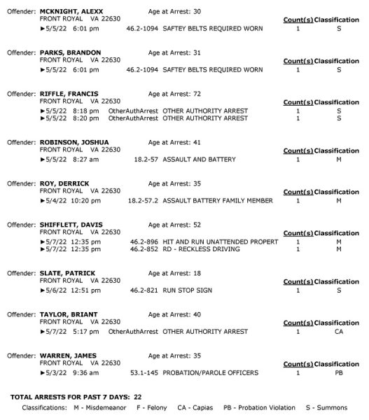 POLICE: 7 Day FRPD Arrest Report 5/9/2022