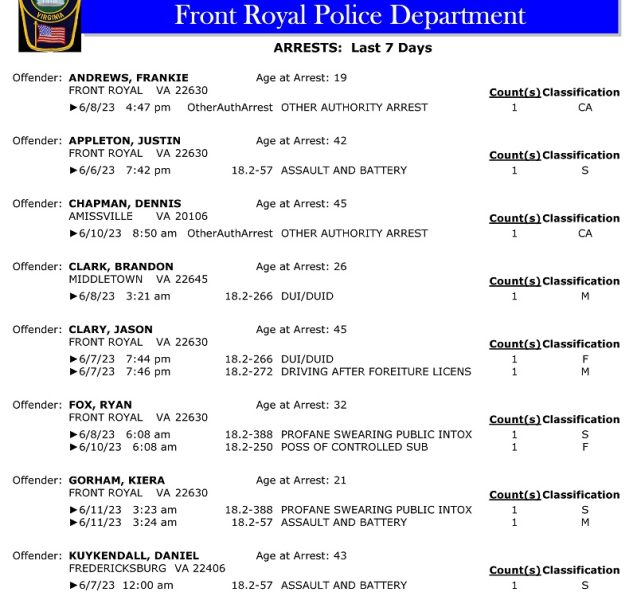 POLICE: 7 Day FRPD Arrest Report 6/12/2023