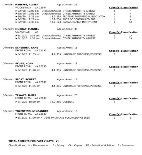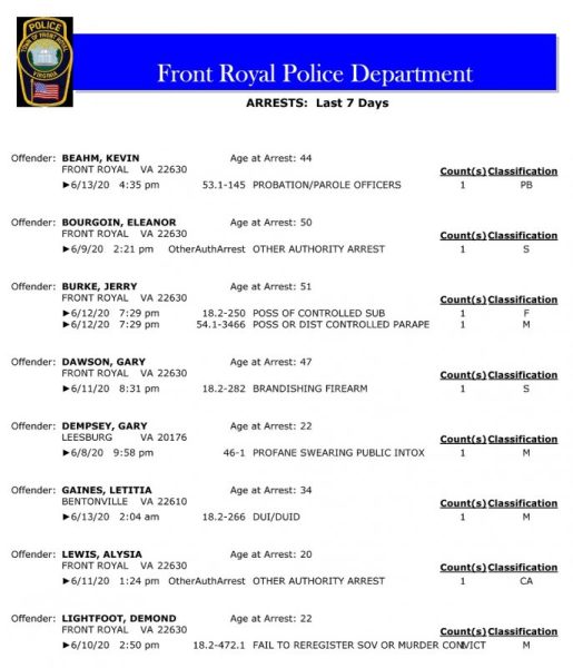 POLICE: 7 Day FRPD Arrest Report 6/15/2020