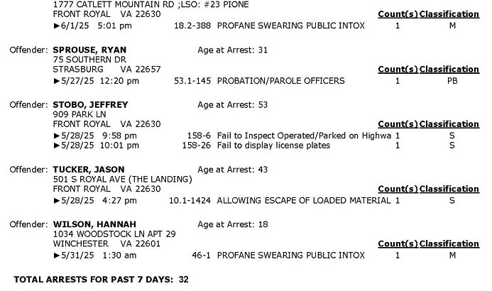 Front Royal Police Department’s arrest report for the past 7 days: