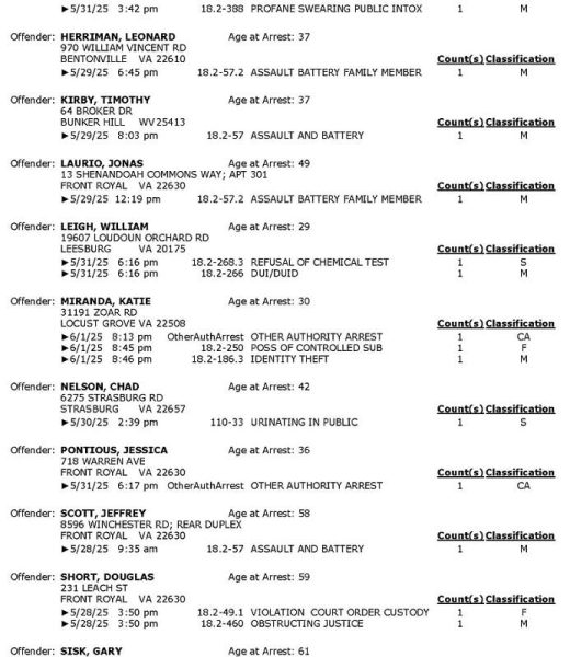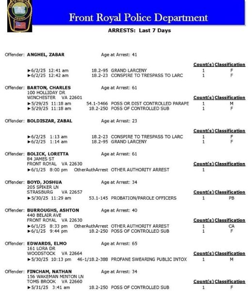 Front Royal Police Department’s arrest report for the past 7 days: