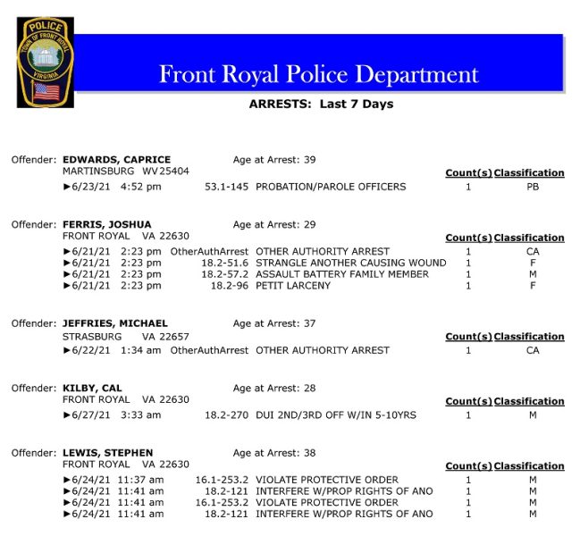 POLICE: 7 Day FRPD Arrest Report 6/28/2021